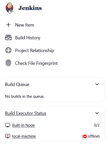In the previous step, we created an inbound agent called local-machine. At this point, you’ll notice it shows as offline in Jenkins — that’s because your local machine hasn’t yet connected back to the Jenkins controller.