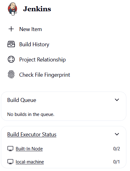 After running the command, refresh your Jenkins dashboard — the local-machine agent should now show as online, ready to accept jobs.
